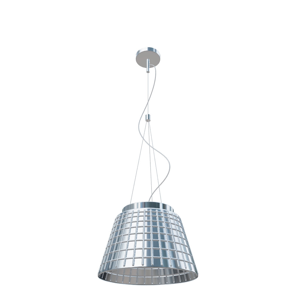 Κρεμαστό απο συμπαγές γυαλί υφής, με επίστρωση απο χρώμιο και στις δύο πλευρές. Όταν είναι ανοιχτό, η πηγή φωτός εμφανίζεται μερικώς μέσα απο το σκίαστρο.