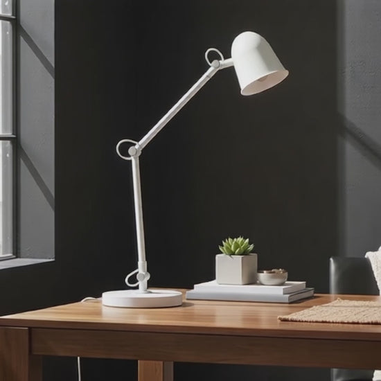 Επιτραπέζιο φωτιστικό με δύο συνδέσμους βραχίονα για πηγές LED με υποδοχή E14. Ο διακόπτης βρίσκεται στο πίσω μέρος της σκιάς.