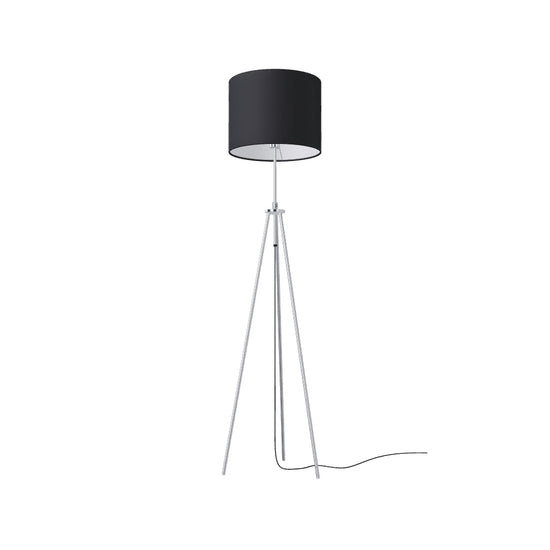 Επιδαπέδιο φωτιστικό σε τρίποδο με ρυθμιζόμενο ύψος σε μαύρο και χρώμιο. Συμπεριλαμβάνεται υφασμάτινο αμπαζούρ και υποδοχή E27.