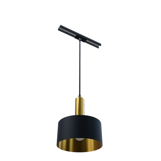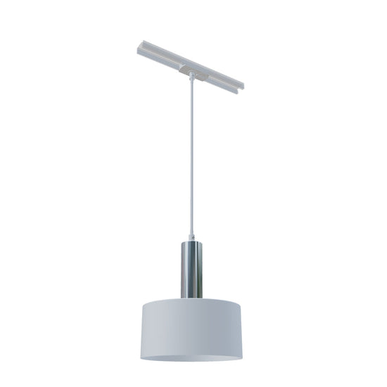 Κρεμαστό φωτιστικό με λακαρισμένη μεταλλική απόχρωση και υφασμάτινο καλώδιο. Το καλώδιο είναι συνδεδεμένο σε έναν αντάπτορα για ράγες ενός κυκλώματος.