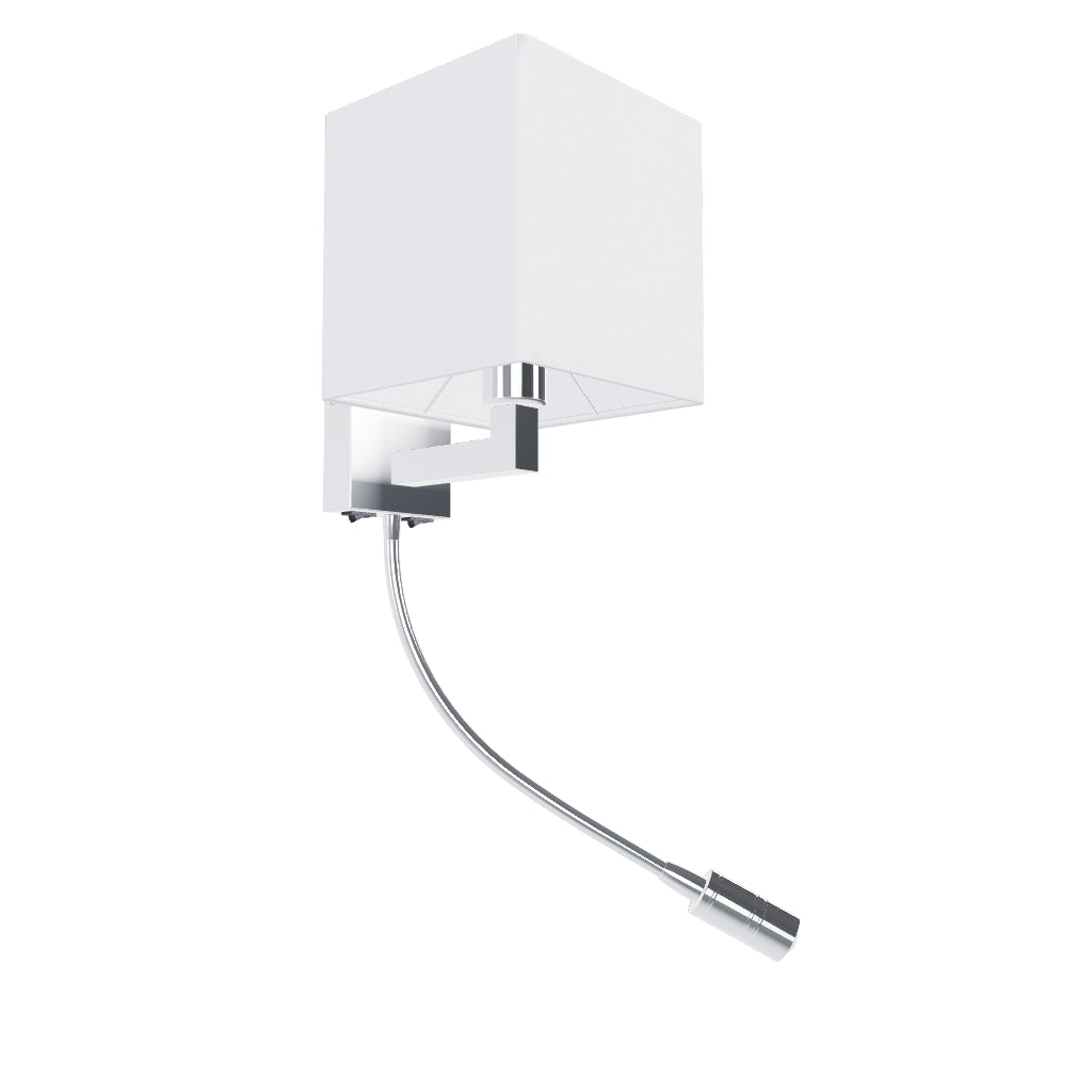 Φωτιστικό τοίχου με υφασμάτινο αμπαζούρ μαζί με φωτιστικό LED σε λαιμό χήνας. Οι δύο πηγές φωτός μπορούν να ανοιγοκλείσουν ξεχωριστά με τους διακόπτες στη τετράγωνη βάση τους.