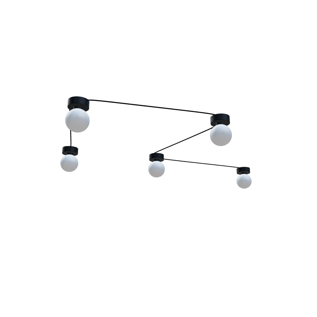 Φωτιστικά οροφής ή τοίχου με γυάλινες αποχρώσεις σε μαύρες λακαρισμένες βάσεις, που συνδέονται στη σειρά με μαύρα καλώδια. Τα φωτιστικά μπορούν να τακτοποιηθούν σε ομάδες ανάλογα με τη φαντασία σας. Κατάλληλο για πηγές φωτός LED με βάση G9.